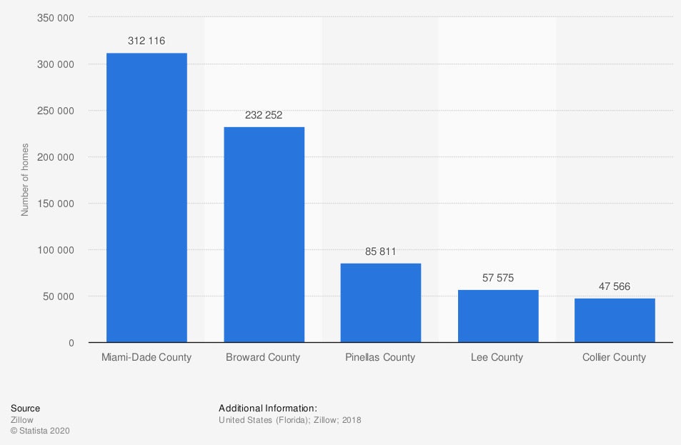 Number of homes at risk of annual coastal flooding in Florida, by county
