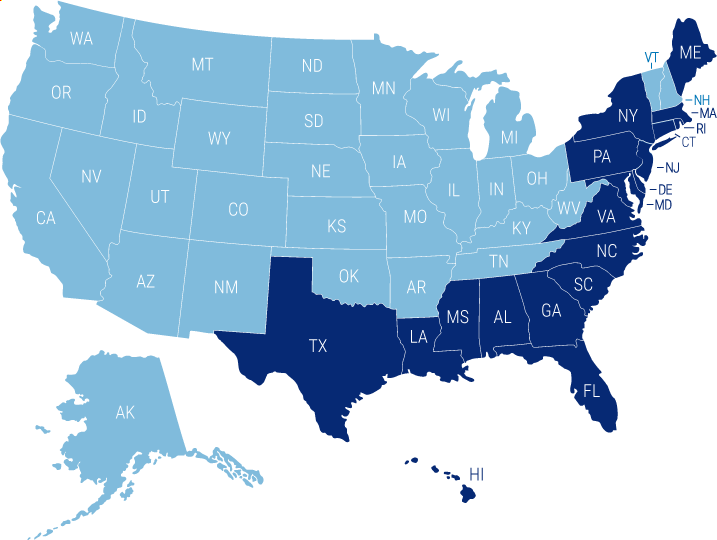 Alabama, Connecticut, Delaware, Florida, Georgia, Hawaii, Louisiana, Maine, Maryland, Massachusetts, Mississippi, New Jersey, New York, North Carolina, Pennsylvania, Rhode Island, South Carolina, Texas, Virginia and Washington DC