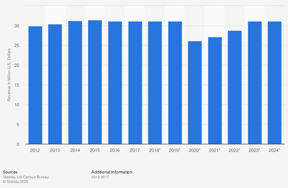 The industry revenue of jewelry stores in the US is actually projected to grow in the coming years. In the beginning of the observed period, annual revenue from jewelry stores totaled $29.86 billion. Within the coming years, this total is projected to increase, to $31.11 billion.